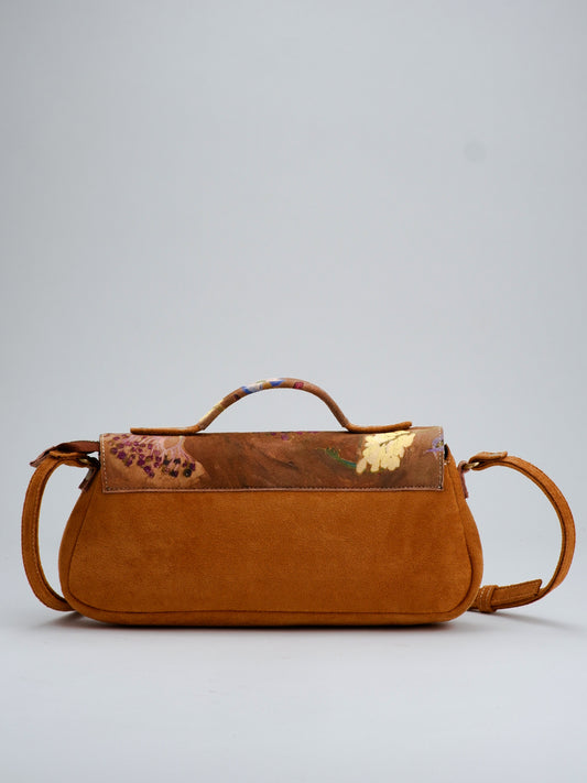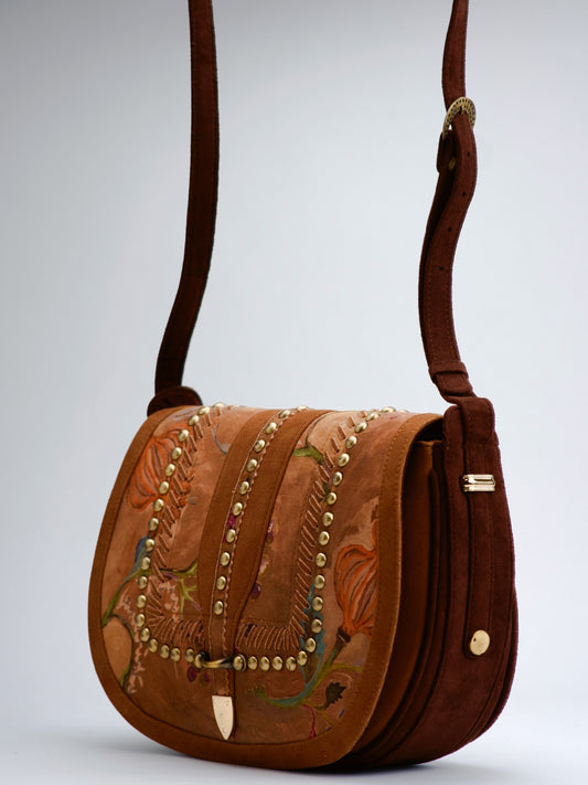 Brown Round Vintage brass frame studded sling bag with brass chains